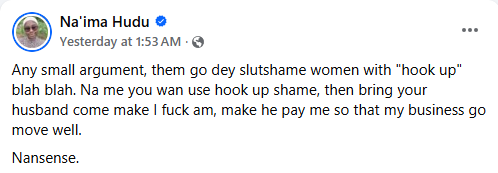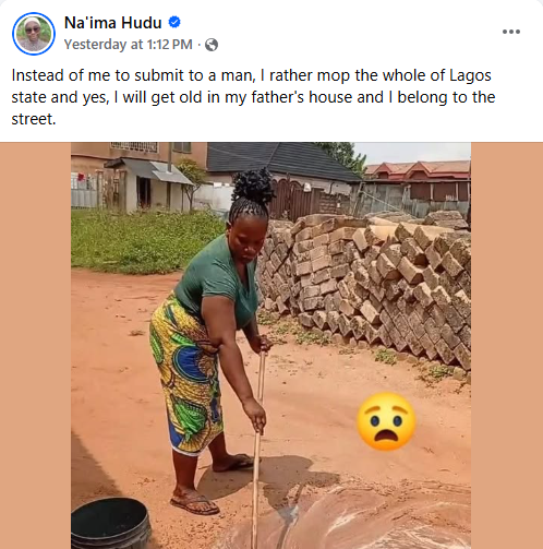 A Nigerian woman, Nai’ima Hudu, who describes herself as a feminist, has said she would rather mop the whole Lagos State than submit to a man.