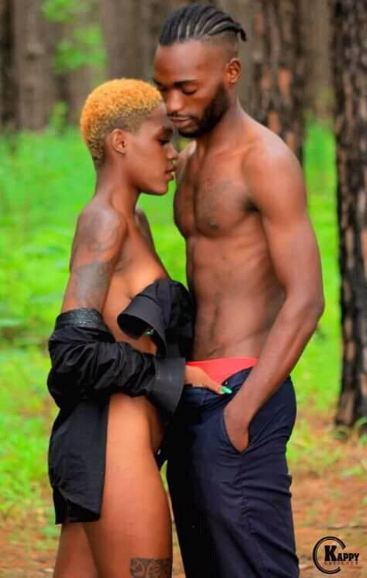The photos, taken in a woodland, show the woman dressed in nothing while the man held a leaf against her private part to cover it.
