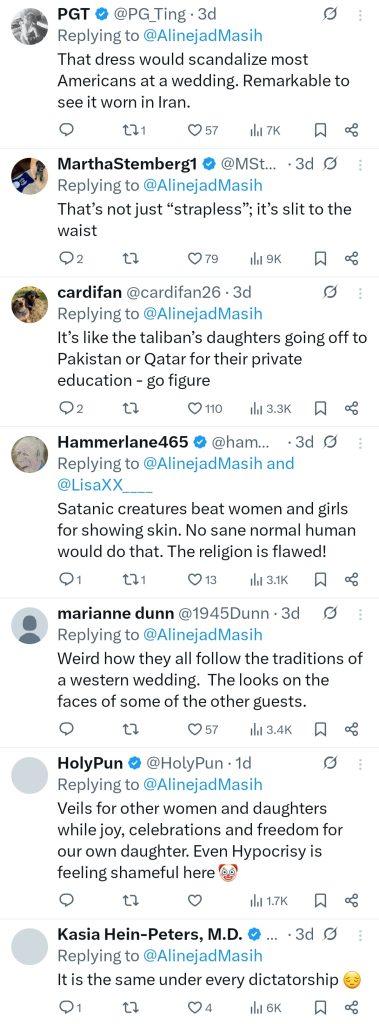 Video showing the daughter of Ali Shamkhani, an aide to Iran’s Supreme Leader, wearing a plunging strapless wedding gown that shows her cleavage and a veil that put her hair on display, has ignited fury.