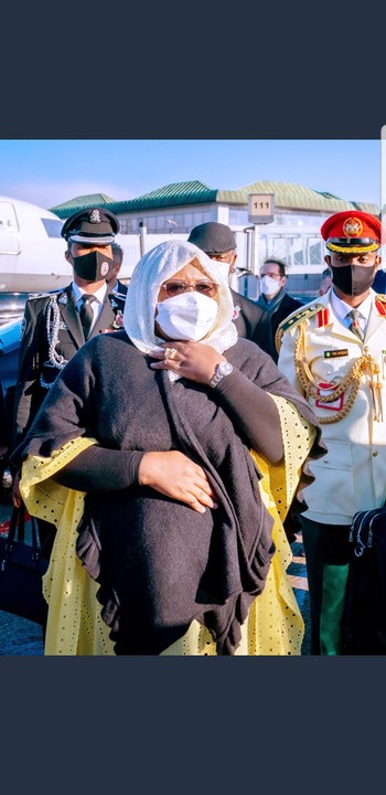 In recent photos Aisha, alongside her husband, President Muhamadu Buhari, was surrounded by security officials, with one of them carrying her handbags.