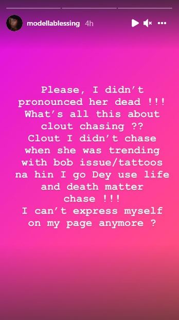 “Please, I didn’t pronounce her dead!!! What’s all this about clout chasing?? Clout I didn’t chase when she was trending with bob issues/tatoos na hin I go dey use life and death matter chase!!! I can’t express myself on my page anymore?”