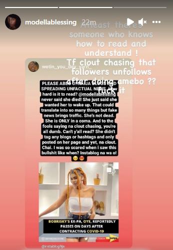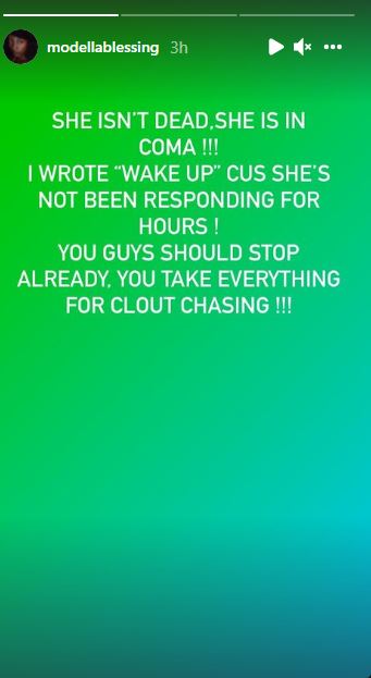 According to her, what she meant by ‘wake up’ is that Oye Kyme has been in Coma for hours, but hasn’t been confirmed dead yet. Taking to her Instagram story a few minutes ago, she wrote: