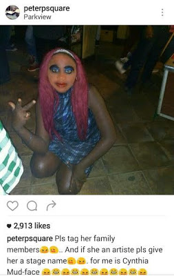 Peter Okoye, of the Psquare duo, just posted this photo of a lady wearing horrible make-up on Instagram and he asked his fans what name they would give the lady if she were an artist.