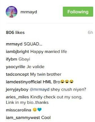 Pop star, May D took to his Instagram account to post a photo with a white lady standing next to him, flaunting what possibly could be a wedding ring…or not! Captioning the photo, he wrote: ‘Squad’ and someone wished him a happy married life!