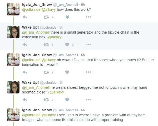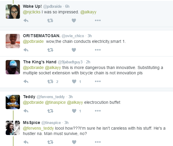 A hot debate is going on on Nigeria Twitter right now as to whether this man’s creation of a bicycle charger is innovative or dangerous.