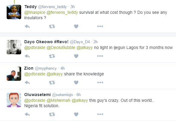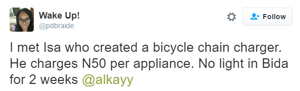 According to Pamela Braide, she met Isa in Bida, Niger state. They haven’t had light for the past two weeks and to survive, Isa created this. He charges N50 per appliance. See how it works below and let’s know what your thoughts are about this innovation, guys.