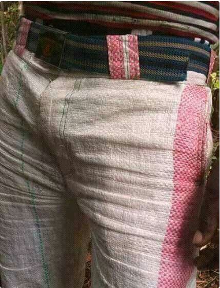 According to Aruwa, this man’s decision to sew his trousers from a sack has been motivated by the recesssion.