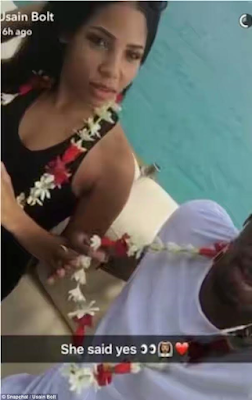The Jamaican sprint star who is currently on vacation with his model girlfriend have been relaxing on the South Pacific Island of Bora Bora. Usain Bolt took to his Snapchat to shares images of himself and Kasi, including the one above with the caption, ‘She said yes’ along with a heart and bride emoji. There’s no rock in sight though.
