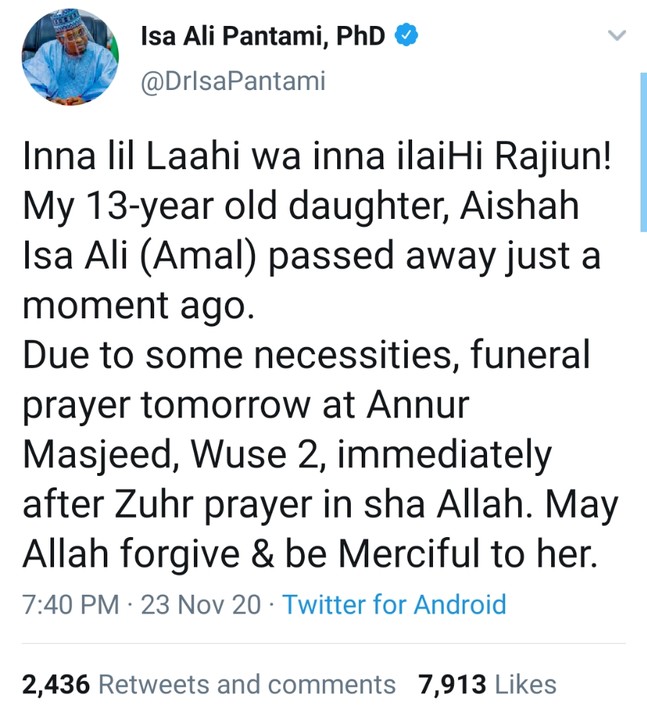 My 13-year old daughter, Aishah Isa Ali (Amal) passed away just a moment ago.Due to some necessities, funeral prayer tomorrow at Annur Masjeed, Wuse 2, immediately after Zuhr prayer in sha Allah. May Allah forgive & be Merciful to her.