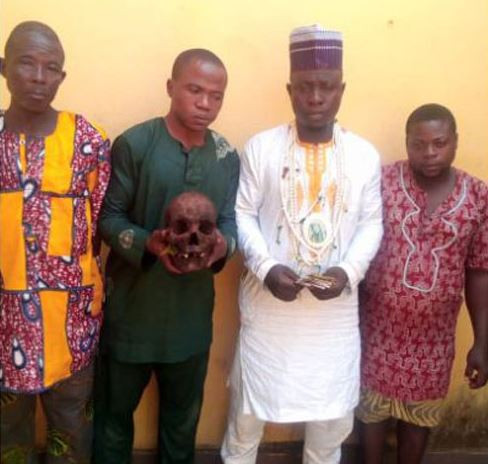 Two of the suspects: Teslim Ayeniromo, 45, and Sunday Kolade , 35, were accosted on a motorcycle, at Kofedoti area of the state, by a team of policemen attached to Agbara division. During a search, the human skull was discovered in a bag one of them held, consequent upon which they were whisked to the Police station.