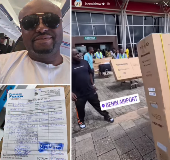 He posted a screenshot of the receipt as well as a video showing the moment the airport staff were wheeling his TV sets to his waiting vehicle.