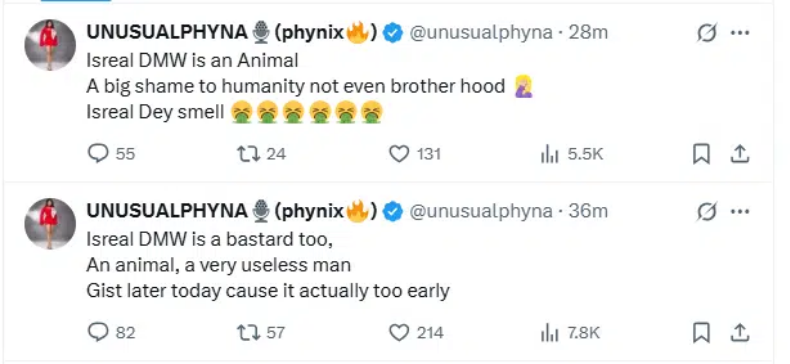 Without any context, Phyna took to her X page to label Davido’s aide, Israel DMW, an ‘Animal.’