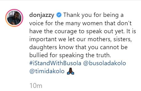 According to Don Jazzy, ‘thank you for being a voice for the many women that don’t have the courage to speak out yet. It is important we let our mothers, sisters, daughters know that you cannot be bullied for speaking the truth’.