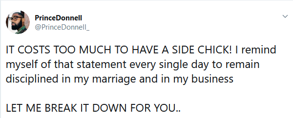 A twitter user Prince Donnell @PrinceDonnell_ while advising men to focus on their family, wrote that it costs too much to have a Side chick.