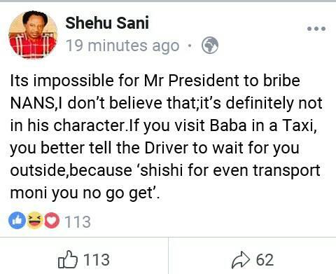 “Its impossible for Mr President to bribe NANS,I don’t believe that;it’s definitely not in his character.If you visit Baba in a Taxi,you better tell the Driver to wait for you outside,because ‘shishi for even transport moni you no go get’.”