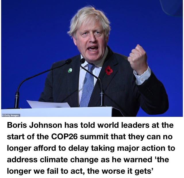 Boris Johnson has told world leaders at the start of the COP26 summit that they can no longer afford to delay taking major action to address climate change as he warned ‘the longer we fail to act, the worse it gets’.