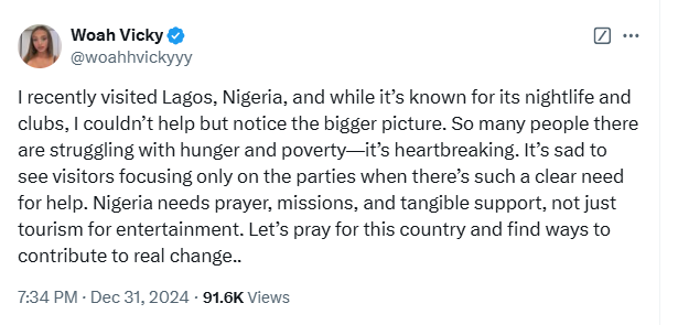 “I recently visited Lagos, Nigeria, and while it’s known for its nightlife and clubs, I couldn’t help but notice the bigger picture. So many people there are struggling with hunger and poverty—it’s heartbreaking. It’s sad to see visitors focusing only on the parties when there’s such a clear need for help. Nigeria needs prayer, missions, and tangible support, not just tourism for entertainment. Let’s pray for this country and find ways to contribute to real change..”