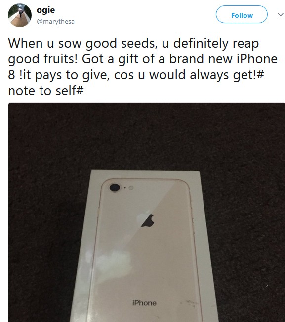 A Nigerian lady, Mary Ogie, has highlighted the importance of giving and sowing good seeds after receiving a brand new Apple iPhone 8 worth over N270,000.