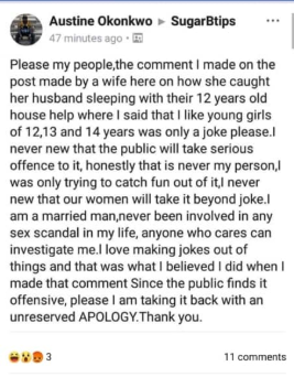 The Nigerian man revealed his love for underaged girls while commenting on a Facebook post in which a woman who allegedly caught her husband sleeping with her 12-year-old niece sought for advice.