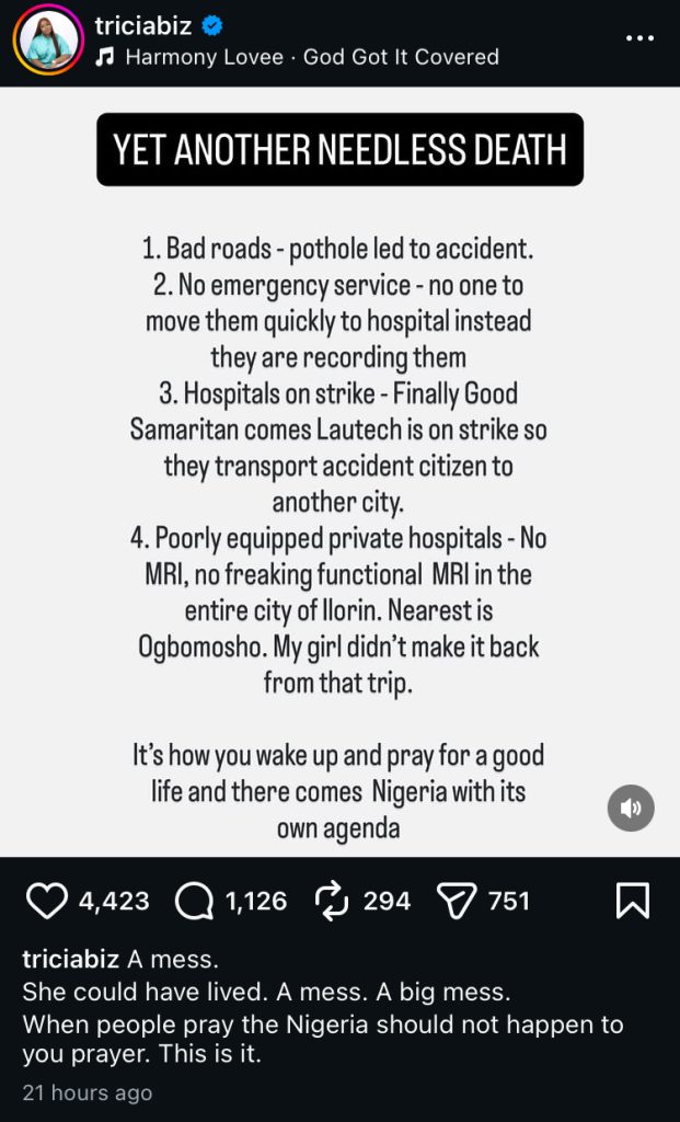 Lucky, popularly known as Digital Creator Chic, died at the age of 29 after a road accident, with lack of emergency response and inadequate medical facilities cited as key factors.