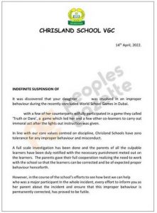 In a public statement, Chrisland school emphasized the action taken to resolve the case as it emphatically stated that the action of the student was a ‘truth and dare’ game.