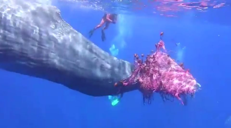 Italian coast guards have been trying for several days to free this massive sperm whale from a net it got entangled in.