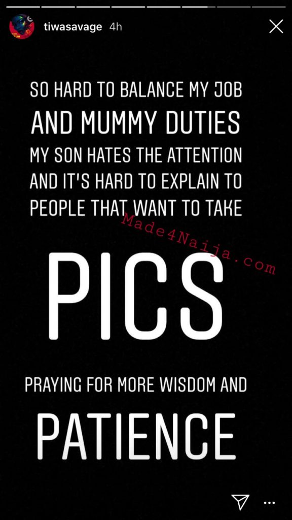 Tiwa Savage who turned up for an event today with her son, took to Insta-story to disclose that it’s hard to explain to people that her son hates