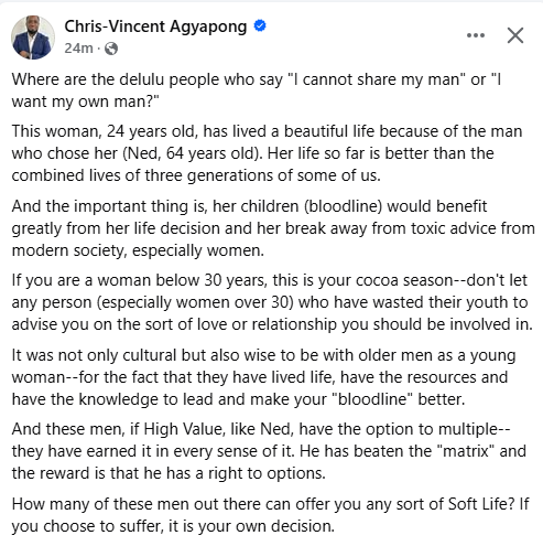 “Where are the delulu people who say “I cannot share my man” or “I want my own man?” This woman, 24 years old, has lived a beautiful life because of the man who chose her (Ned, 64 years old). Her life so far is better than the combined lives of three generations of some of us,” he wrote.