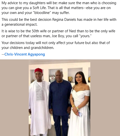 A Ghanaian lawyer, Chris-Vincent Agyapong, has said that it’s better for a woman to be the 50th wife of billionaire businessman, Senator Ned Nwoko than to be the only wife of a useless man.