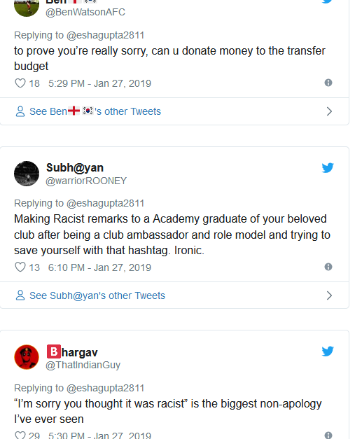”Guys I am sorry you thought it was racist. Was bad on my part, being a sports lover. Sorry guys, forgive the stupidity.’