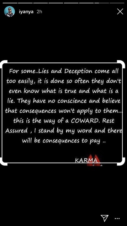 The singer stated that lies and deception come to some people easily, that they don’t know what is lie and true again. He further added that there will always be a consequence to pay, even though these people believe that there won’t be any because they have no conscience. Iyanya who talked about Karma in his shade post for Ubi Franklin wrote;