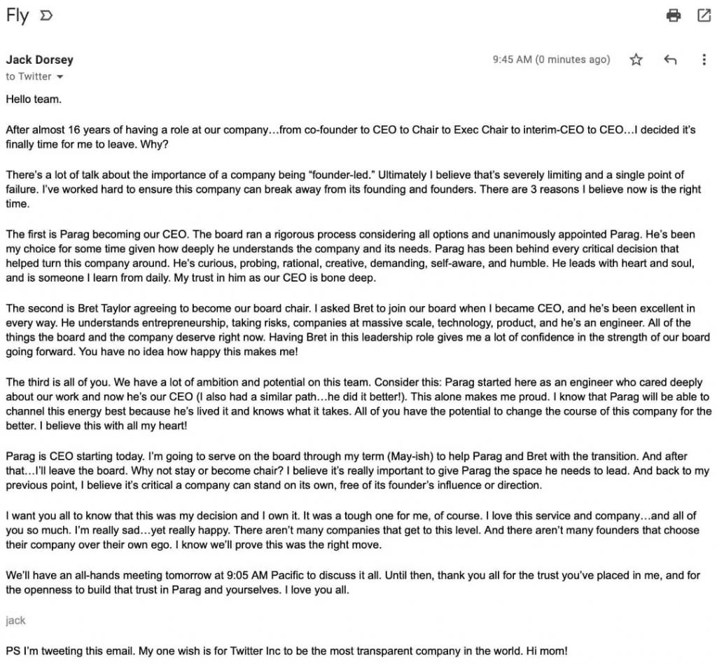 Dorsey, who founded the social media giant, served as CEO until 2008 before being pushed out of the role. He returned to Twitter as boss in 2015 after former CEO Dick Costolo stepped down.
