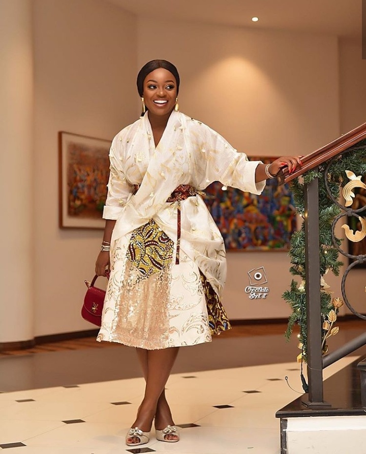 Jackie Appiah celebrates her own Christmas by posing in style with xmas tree. She looks so admirable in her chic outfit which was adorned with glittering accessories.