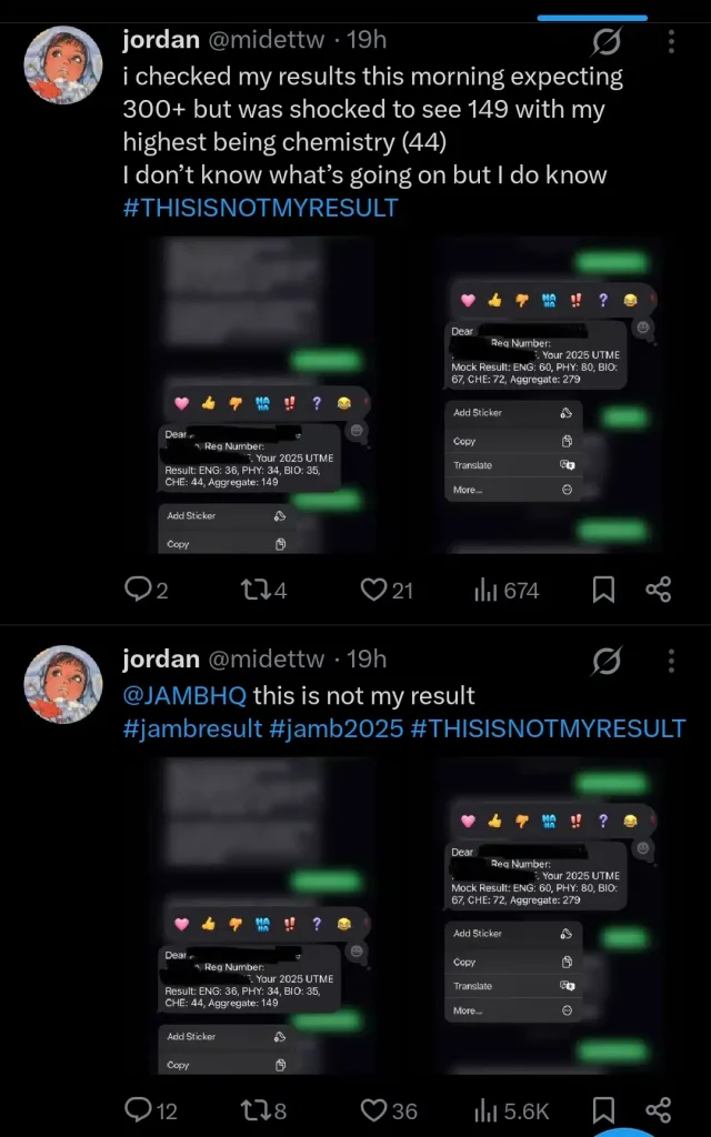 Her posts have sparked mixed reactions online, with many calling on JAMB to investigate the claim and ensure the integrity of the results.
