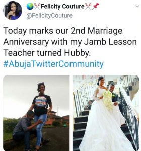 A woman who got married to her former JAMB lesson teacher took to social media to celebrate their anniversary.