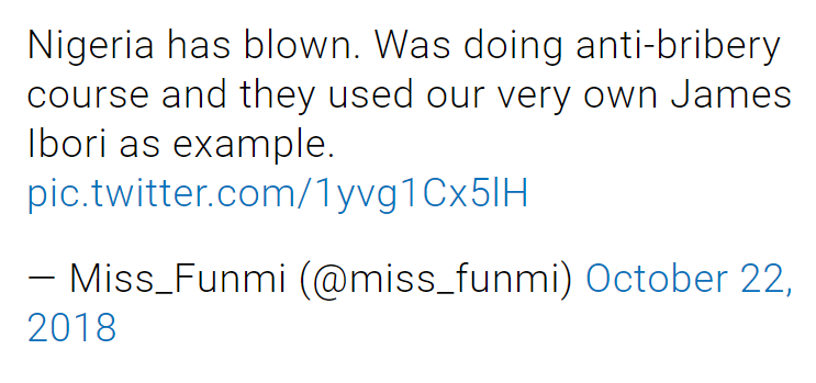 She wrote: ‘Nigeria has blown. Was doing anti-bribery course and they used our very own James Ibori as example.’