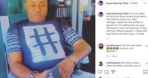 ”Tony you called me with your sister Janemena to pls talk to king Tonto to saved your sister marriage…maybe the next petition is against me. I’m waiting since you guys still trying to harm me receiving so many calls from different people, I stand with king Tonto court here we go. I’m Alive.’‘