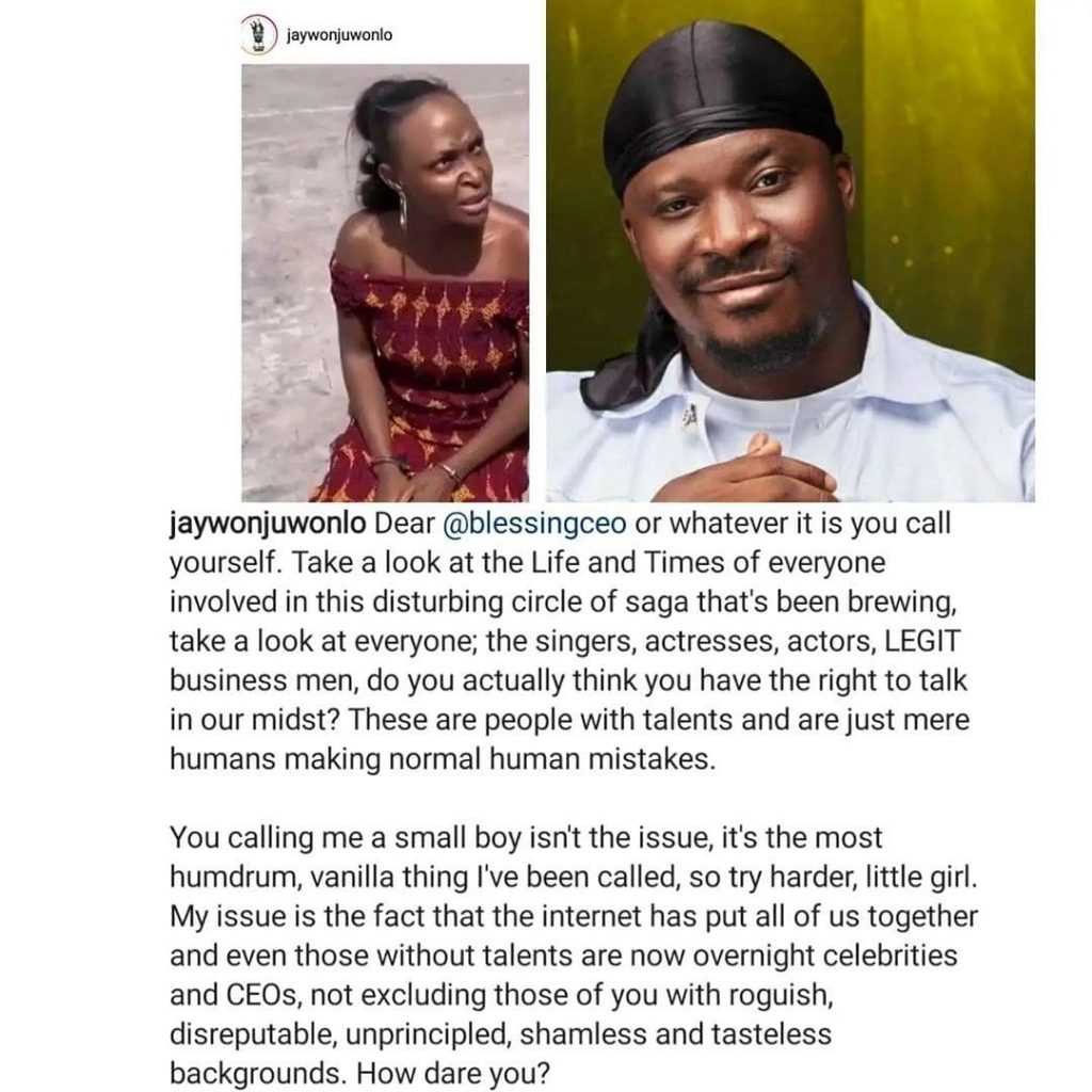 Singer Jaywon hits back heavily with a hammer crushing blow after Blessing aokoro referred to him as a ‘small boy’..