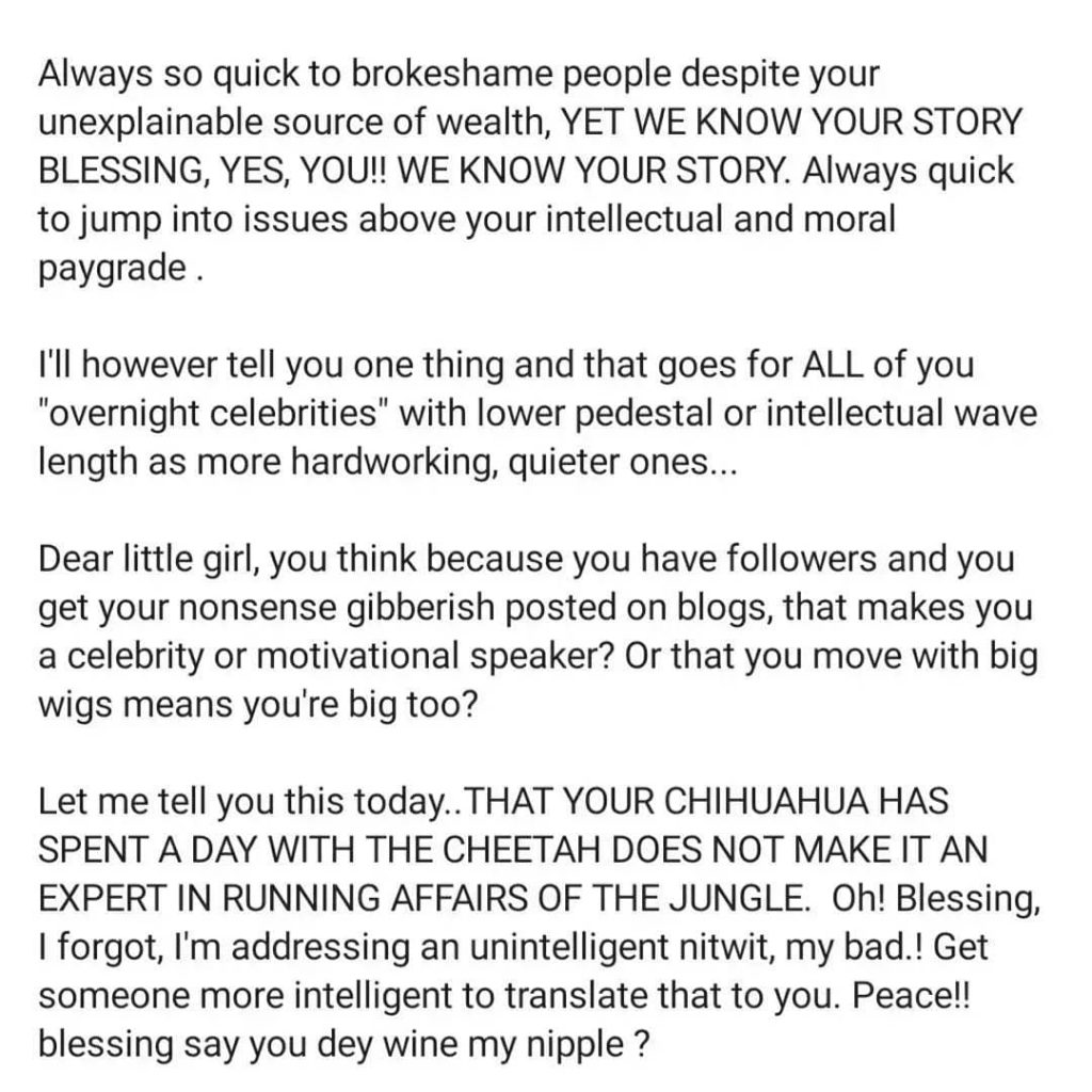 Always so quick to brokeshame people despite your unexplainable source of wealth, YET WE KNOW YOUR STORY BLESSING, YES, YOU!! WE KNOW YOUR STORY. Always quick to jump into issues above your intellectual and moral paygrade .