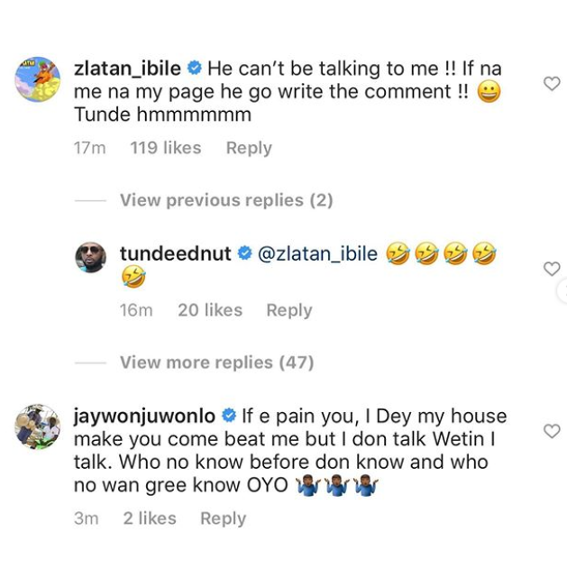 Jaywon also threw a shade at Zlatan on Tunde Ednut’s page.