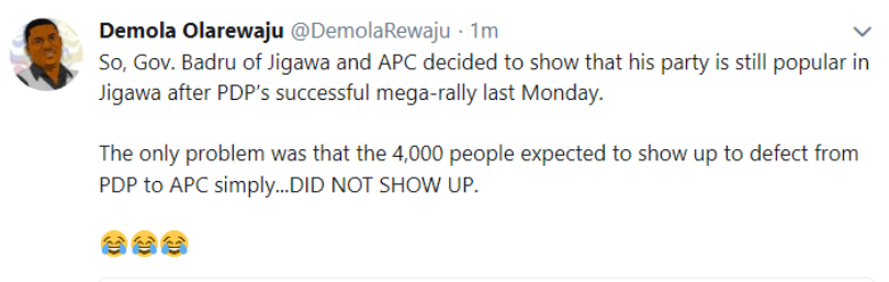 Governor Muhammad Badaru Abubakar of Jigawa state went home disappointed when 4000 Peoples Democratic Party (PDP) decampees failed to appear at a rally as earlier announced.