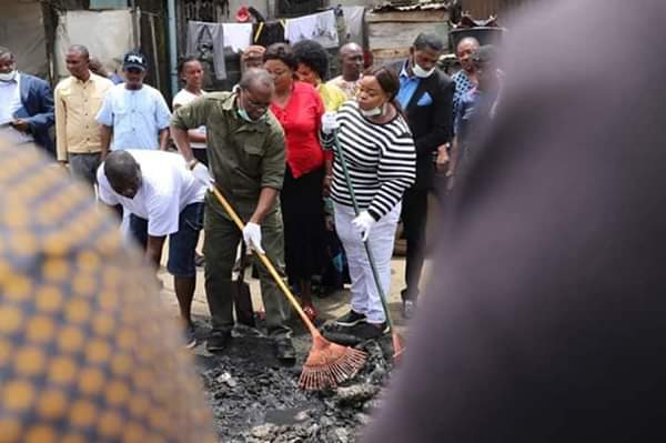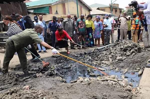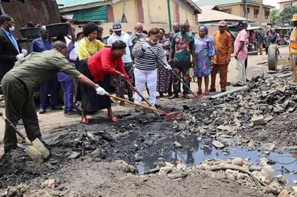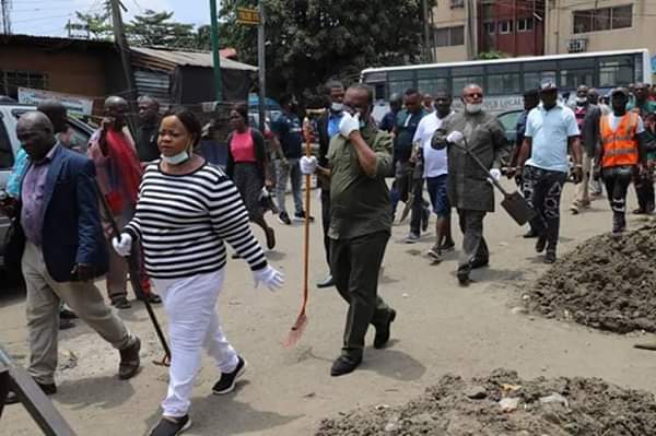 Special Adviser on Drainage and Water Resources to Lagos State Governor, Engineer Joe Igbokwe, Commissioner for Local Government and Community Affairs, Hon Yetunde Arobieke, Chairman, Ajeromi Ifelodun LG, Hon Fatai Ayoola and Vice Chairman, Hon Nkem Igwe were pictured during the clearing of stilts and dirts evacuated from tertiary drains at Iyalode street in Ajeromi Ifelodun Local Government on Thursday.