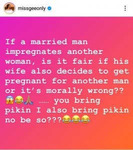 She wrote: “If a married man impregnates another woman, is it fair if his wife also decides to get pregnant for another man or it’s morally wrong??