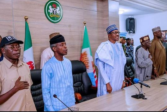 Sharing photos of President Buhari, VP Osinbajo, national chairman of APC Adams Oshiomole, and APC national leader Bola Tinubu, she wrote: