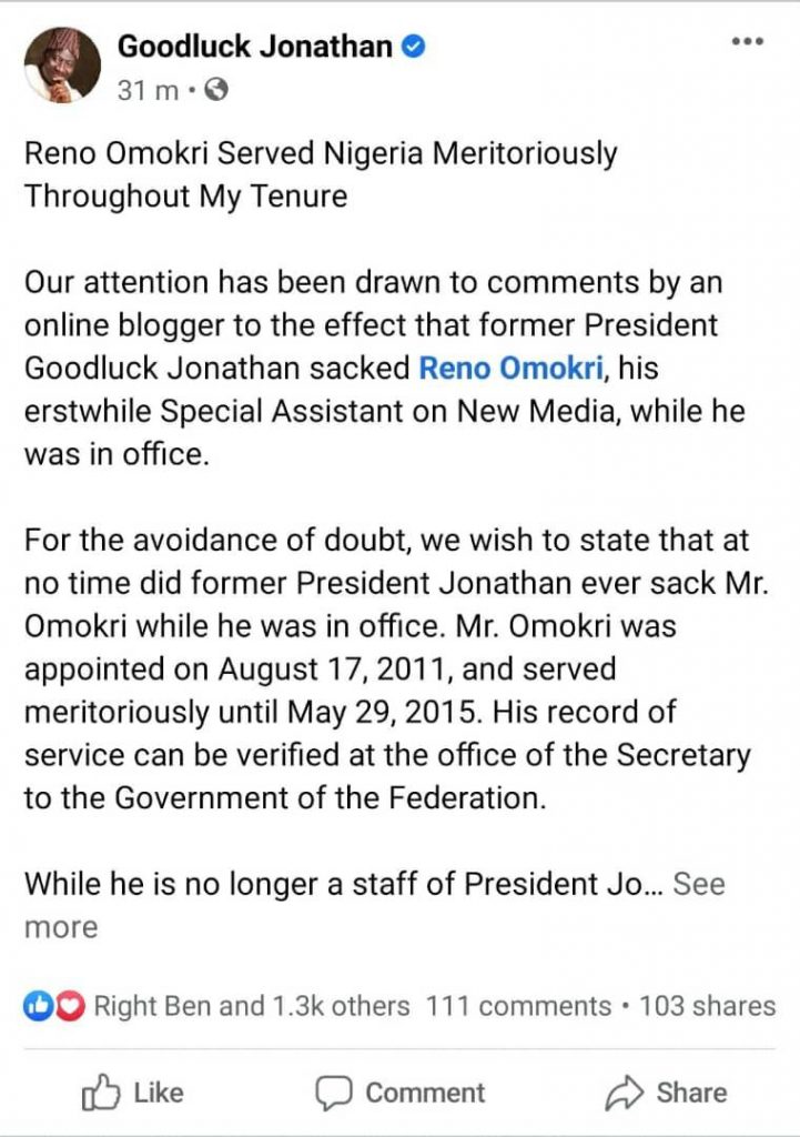 Our attention has been drawn to comments by an online blogger to the effect that former President Goodluck Jonathan sacked Reno Omokri, his erstwhile Special Assistant on New Media, while he was in office.