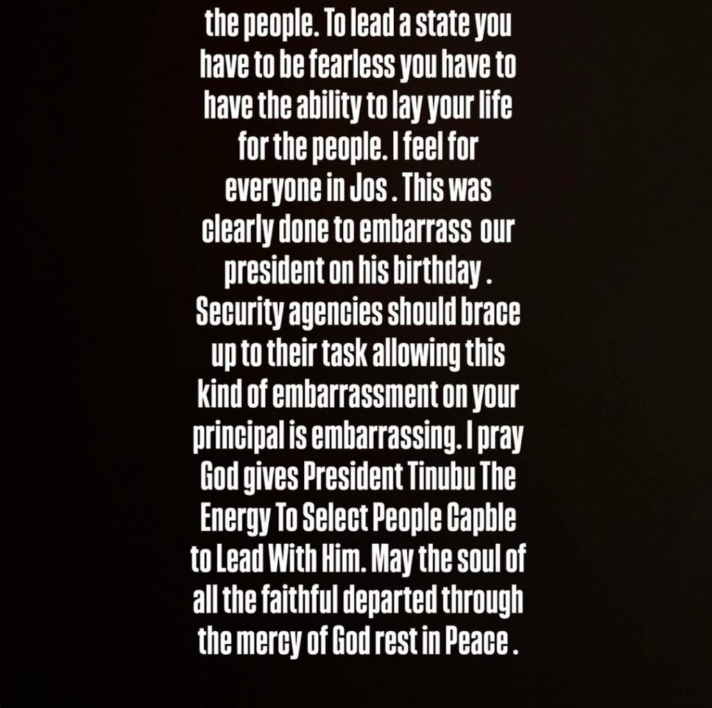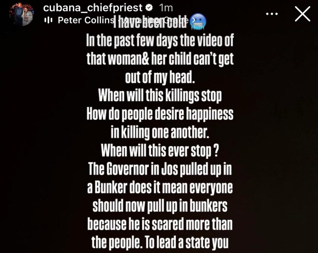 In a post shared on Instagram this afternoon March 31, Chiefpriest called out the state governor, Caleb Mutfwang. for visiting the scene of the att@ck in an armoured tanker. He also stated that it is embarrassing for the security agents to allow such an att@ck happen on the President’s birthday.