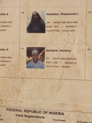 Sitting on his praying mat spread across the elevated platform of a resident where the names and pictures of eligible voters have been pasted, Shettima holds tight his holy Qur’an while his PVC is tucked in his pocket.