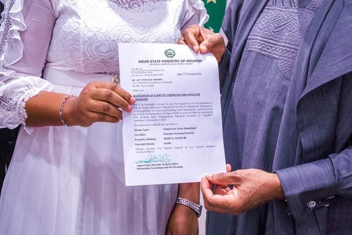 In line with the State Government’s commitment to hard work portrayed in indigenes within and outside the State, she has been gifted a bungalow, 5million Naira cash prize and residency scholarship at the Olabisi Onabanjo University Teaching Hospital, OOUTH.