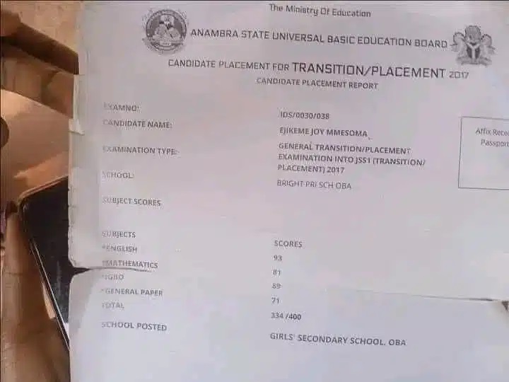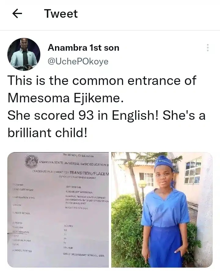 A photo of Mmesoma Ejike’s 2017 common entrance examination result sheet has surfaced online.