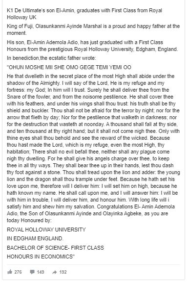 El-Amin Ademola Adio, the son of veteran fuji musician, King Wasiu Ayinde Marshall, has achieved a milestone in UK after graduating with a first class.